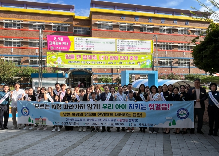 [뉴스스텝] 경산교육지원청은 9월 15일 8시부터 사동초등학교에서 최근 초등학교 인근 미성년자 유괴 사건 발생에 따른 유사 범죄를 예방하고, 모든 학생이 안전하고 건강하게 성장할 수 있는 안심 교육 환경을 조성하기 위한 범죄 예방 캠페인을 진행했다.