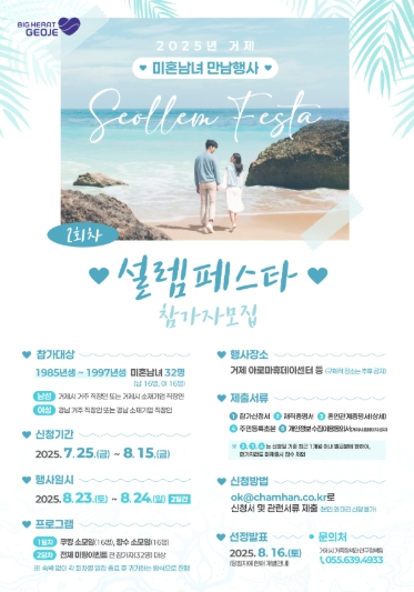 [뉴스스텝] 거제시는 미혼남녀의 건전한 만남을 지원하고 결혼 친화적 사회 분위기 조성을 위해 2025년 거제 미혼남녀 만남행사 2회차'설렘 페스타'참가자를 모집한다.