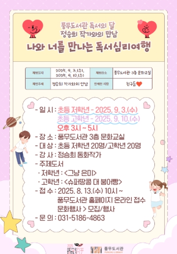 [뉴스스텝] 김포시 풍무도서관은 9월 독서의 달을 맞이하여 오는 9월 3일과 10일 오후 3시부터 5시까지 총 2회에 걸쳐 정승희 작가와의 만남 ‘나와 너를 만나는 독서심리여행’을 운영한다.