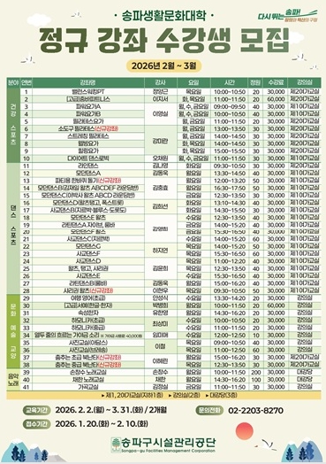 수강 접수 기간은 기존 수강생은 1월 27일까지, 신규 수강생은 1월 29일부터 2월 3일까지 순차 진행된다. 신청은 송파구시설관리공단 홈페이지 온라인 접수 또는 송파문화예술회관 1층 생활문화대학 사무실 방문을 통해 가능하다.