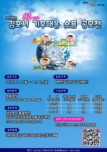 참가 자격은 대한민국 국민 누구나 개인 자격으로 가능하며, 부문은 ▲아동·청소년부(2007년생~) ▲일반부(~2006년생)로 나뉜다. 영상은 60초 이내의 숏폼 형식으로 제작해야 하며, 주제는 생성형 인공지능(AI)를 활용해 기후변화, 탄소중립, 미세먼지 저감 등 시의 기후정책을 홍보할 수 있는 내용이면 된다. ‘내가 실천하는 탄소중립 행동’, ‘폭염 대응 꿀팁’, ‘걷기 좋은 김포를 위한 대중교통 이용법’, ‘인공지능(AI)가 알려주는 기후위기의 미래’ 등 자유로운 아이디어가 가능하다.