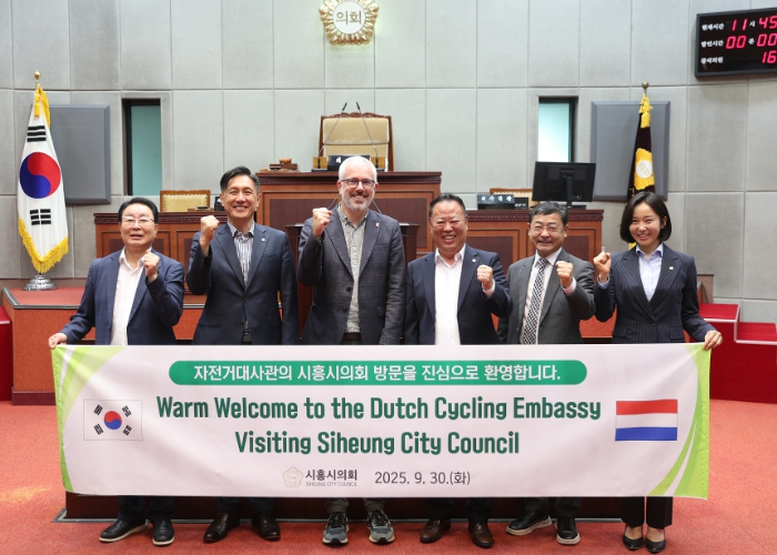 [뉴스스텝] 시흥시의회 도시환경위원회가 9월 30일 의회청사 소담뜰에서 네덜란드 자전거대사관(Dutch Cycling Embassy, DCE)을 초청해 간담회를 열고, 시흥시 자전거 정책 발전 방향과 친환경 교통 시스템 구축 방안에 대해 논의했다.