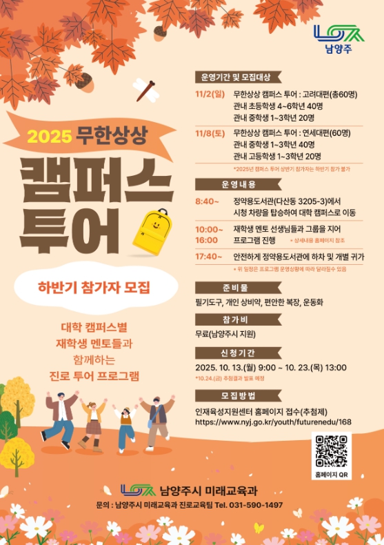 [뉴스스텝] 남양주시는 10월 13일부터 10월 23일까지 관내 초등학교 4학년부터 고등학교 3학년을 대상으로 ‘무한상상 캠퍼스 투어’ 참가자를 모집한다.