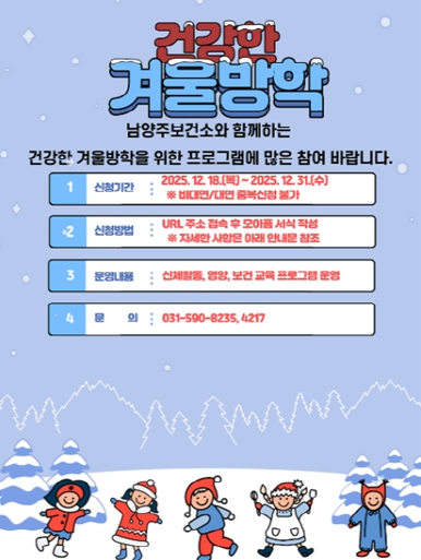 [뉴스스텝] 남양주보건소는 겨울방학 동안 관내 초등학생들을 대상으로‘초등학생이 건강한 겨울방학’프로그램을 이달 9일부터 내달 6일까지 4주간 운영한다고 7일 밝혔다.