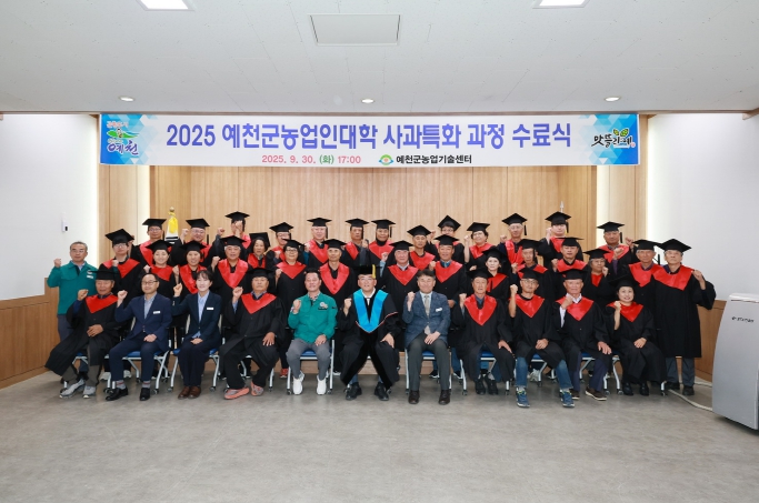 [뉴스스텝] 예천군은 30일, 농업인대학생 40여 명이 참석한 가운데 ‘예천군농업인대학 사과 특화과정 수료식’을 개최했다. 이 자리에는 김학동 군수와 강영구 군의회 의장, 도기욱 경북도의원 등 주요 인사들도 참여해 수료자들을 축하했다.