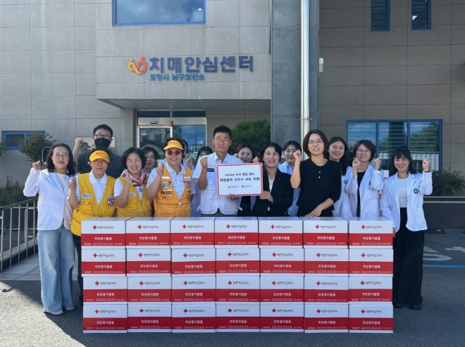 ▲ 포항시 남구보건소 치매안심센터는 29일 대한적십자사 경상북도지사 동부봉사관으로부터 후원받은 ‘희망풍차’ 기탁 물품을 치매 어르신 가정에 전달했다. |