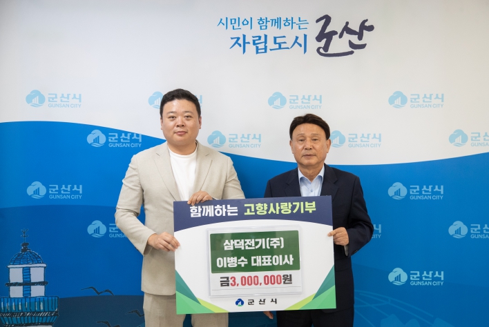 [뉴스스텝] 군산시는 삼덕전기(주) 이병수 대표이사가 고향사랑기부금 300만 원을 기탁했다고 밝혔다.