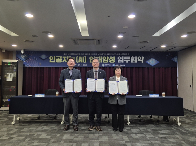 [뉴스스텝] 제주국제자유도시개발센터는 12월 11일 제주대학교, 제주상공회의소와 함께 도내 인공지능(AI) 전문인재 양성을 위한 업무협약을 체결했다.