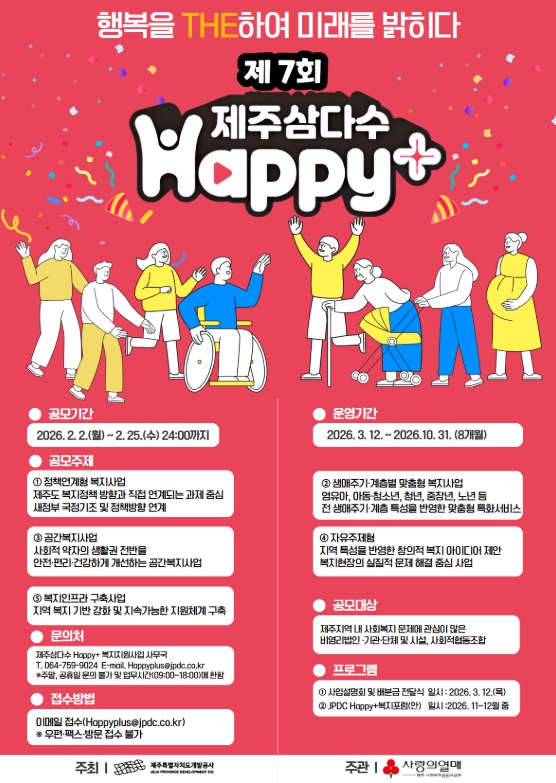 참여를 희망하는 단체는 오는 2월 25일까지 제주개발공사 홈페이지, 제주사회복지공동모금회 홈페이지에서 신청 서류를 내려받아 작성 후 이메일로 제출하면 된다. 자세한 사항은 제주삼다수 Happy+복지 공모사업 사업국을 통해 문의할 수 있다.