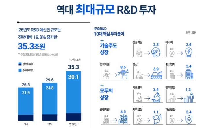 ▲ 2026년도 투자 규모 및 주요R&D 10대 핵심 투자분야(출처 과학기술정보통신부) |