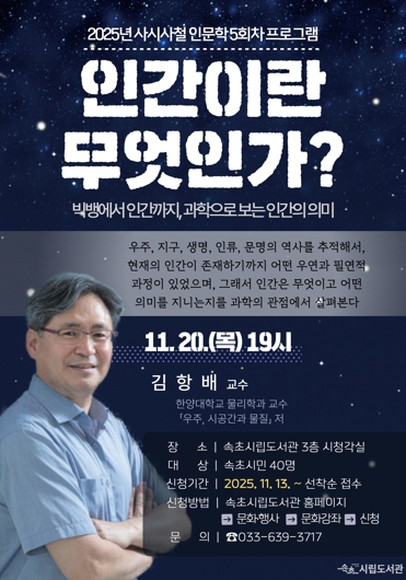 [뉴스스텝] 속초시립도서관은 11월 20일 19시, 도서관 시청각실에서 시민 40여 명을 대상으로 2025 사시사철 인문학 마지막 특강 ‘인간이란 무엇인가?’를 개최한다.