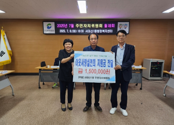 [뉴스스텝] 부산광역시 서구 서대신1동 주민자치위원회(위원장 정종영)는 지난 8일, 7월 월례회의에서 서대신1동 이웃사랑실천회(회장 장종구)에 주민복지 향상을 위한 사업에 써달라며 지원금을 전달했다.