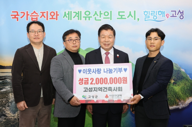 [뉴스스텝] 고성군은 대한건축사협회 고성지역건축사회(회장 신재규)가 12월 24일 고성군을 방문하여 관내 저소득계층에 전달해 달라며, 이웃돕기 성금 200만 원을 기탁했다.
