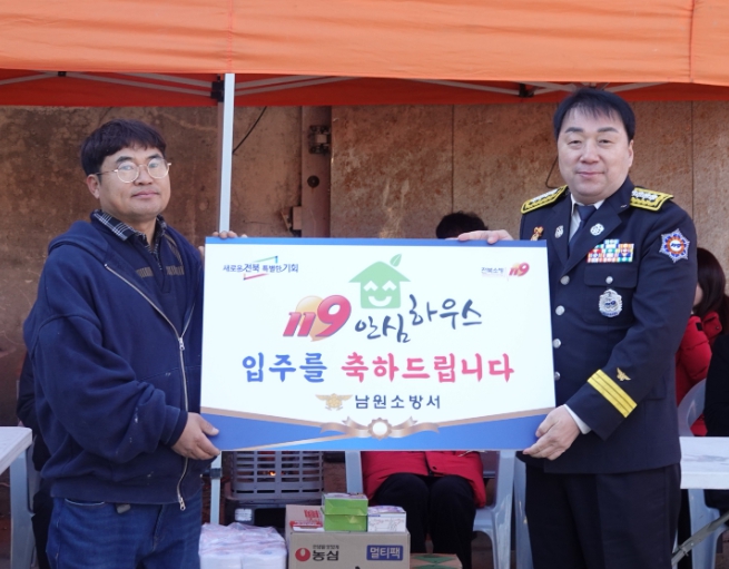 이날 입주식에는 전북특별자치도소방본부와 남원소방서를 비롯해 전북사회복지공동모금회, 남원시노인복지관, 주천면 행정복지센터, 남·여 의용소방대, 마을 이장 등 관계자들이 참석한 가운데 ▲입주선물 전달 ▲입주자 감사인사 ▲기념촬영 등이 진행됐으며, 기초소방시설과 생필품 등 입주 선물을 전달하며 새로운 생활의 시작을 응원했다.