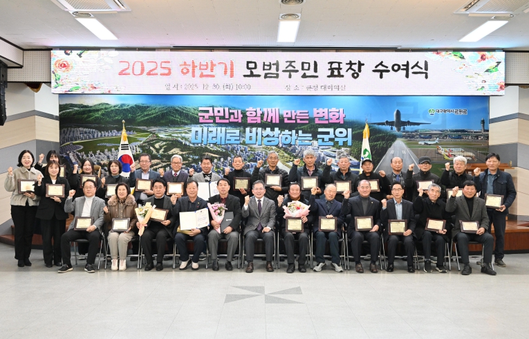 [뉴스스텝] 군위군은 30일 오전 10시 군청 대회의실에서 수상자와 가족, 부서장 등 50여 명이 참석한 가운데 2025년도 하반기 모범 주민에 대한 표창 수여식을 개최했다.