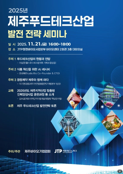 제주테크노파크(원장 지영흔, 제주TP)는 제주바이오기업협회(회장 김성후)와 함께 오는 21일 오후 4시 제주TP 청정바이오사업본부 바이오센터 2호관 3층 대회의실에서 ‘제주 푸드테크 산업 생태계 조성 및 활성화’를 주제로 2025년 제주푸드테크산업 발전 전략 세미나를 개최한다고 20일 밝혔다.