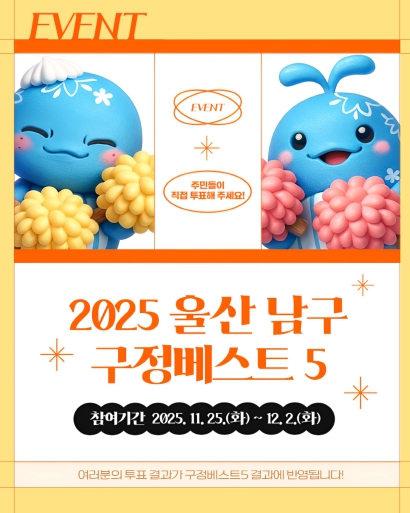 [뉴스스텝] 울산 남구는 2025년에 추진한 정책 중에서 구정 발전과 구민 삶의 질 향상에 기여하고 가시적인 성과를 거둔 정책을 구민이 직접 참여하는 설문조사를 통해 ‘구정베스트’로 선발한다고 밝혔다.