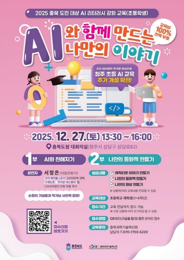 [뉴스스텝] 충청북도는 오는 12월 27일 13:30 충북도청 대회의실에서 도내 초등학생(3~6학년)과 학부모 200여명을 대상으로 ‘AI 웹툰 교육(중부권 2차)’을 진행한다고 밝혔다. 이번 교육은 북부권(충주), 남부권(옥천), 중부권 1차(청주)에 이어 2025년 마지막으로 개최되는 도내 AI 창작 체험 프로그램이다.