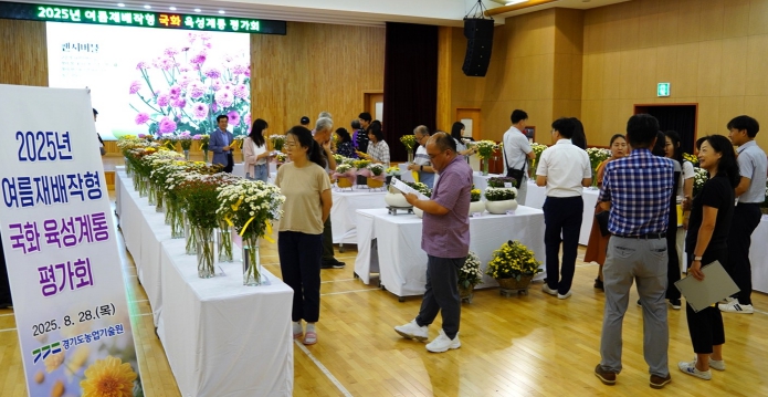 [뉴스스텝] 경기도농업기술원은 28일 농업과학교육관에서 여름철 고온 환경에서도 안정적으로 생육·개화하는 국화 신품종 선발을 위한 평가회를 개최했다.