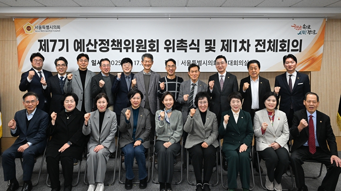 [뉴스스텝] 서울특별시의회는 2025년 12월 17일 제1대회의실에서 위촉식과 제1차 전체회의를 개최하여 시의회의 예산정책기능 강화를 위한'제7기 예산정책위원회'를 출범시켰다. 이날 최호정 의장(서초4, 국민의힘)은 위원들에게 위촉장을 수여했고, 이후 진행된 제1차 전체회의에서 신복자 의원(동대문4, 국민의힘)이 위원장으로 선출됐다.