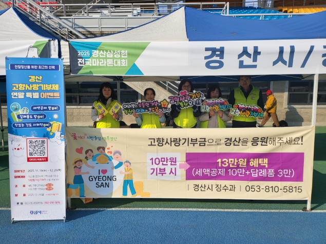 이번 마라톤대회는 경산시체육회에서 주최하고 경산시육상연맹이 주관한 대회로 전국에서 마라톤 동호인 900여 명이 참여해 레이스를 펼쳤다. 경산시는 고향에 기부하고 기부금은 지역 발전과 주민 복지에 사용하는 고향사랑기부제를 보다 많은 분에게 알리기 위해 부스에서 피켓 캠페인과 핫팩 나눔 행사를 진행하여 전국 마라토너들의 호응을 이끌었다.