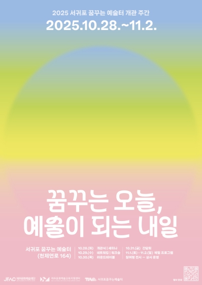 류일순 제주도 문화체육교육국장은 “서귀포 꿈꾸는 예술터는 지역의 문화적 균형 발전을 이끌어갈 중요한 거점”이라며 “도내 최초 공공 문화예술교육 전용시설을 통해 도민 누구나 일상에서 예술을 향유하며 더 풍성한 삶을 누릴 수 있도록 지원하겠다”고 말했다.
