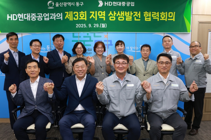[뉴스스텝] 울산 동구청과 HD현대중공업은 9월 29일 오전 11시 동구청장실에서 ‘제3회 지역 상생발전 협력회의’를 개최했다. 이날 회의에는 김종훈 동구청장과 HD현대중공업 김상회 전무를 비롯한 양측 간부 공무원과 임직원이 참석했다.