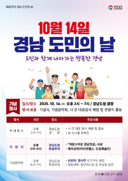 [뉴스스텝] 경상남도는 10월 14일 오후 2시부터 7시까지 경남도청 광장 일원에서 ‘제42회 도민의 날’ 행사를 개최한다고 밝혔다.