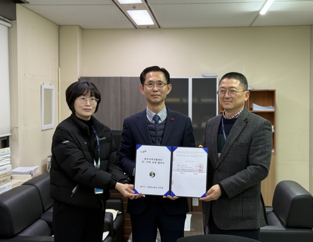 | ▲ 충주시·사회복지법인 숭덕원 지역자활센터 재위탁 협약(왼쪽부터 변현정 숭덕원 법인 팀장, 변근세 충주시복지국장, 김기용 숭덕원 충주지역자활센터장) |