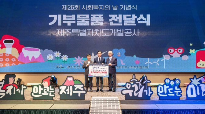 제주특별자치도개발공사(사장 백경훈)는 최근 열린 사회복지의 날 행사에서 2025 추석맞이 행복 나눔 꾸러미 기부금 5천만 원을 전달한 것과 관련, 26일부터 도내 취약계층 500가구에 꾸러미를 배송하고 있다고 밝혔다.