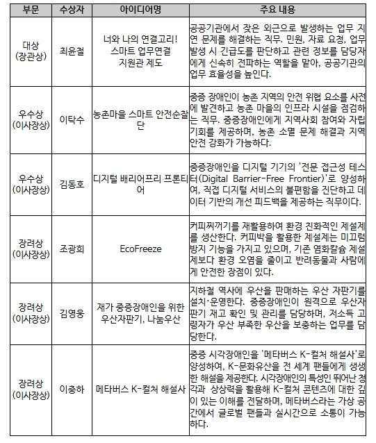 ‘인공지능(AI) 농업로봇 오퍼레이터’는 인공지능(AI), 로봇 등 첨단 기술을 접목하여 미래산업 변화에 발맞춘 장애인 직무로 높은 점수를 받았다. ‘스마트 업무연결 지원관 제도’는 장애인을 채용함으로써 공공기관의 업무 비효율을 줄이고 국민 서비스 만족도를 높일 수 있는 아이디어를 제시하여 수상작에 선정됐다.
