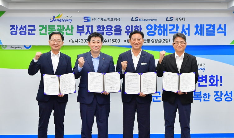군은 20일 군청 상황실에서 ㈜석세스뱅크장성, LS일렉트릭㈜, LS사우타㈜와 양해각서를 체결했다. 김한종 장성군수, 전재연 ㈜석세스뱅크장성 대표이사, 정현만 LS일렉트릭㈜ 데이터센터 팀장, 박우범 LS사우타㈜ 대표 등 관계자들이 협약식에 참석했다.