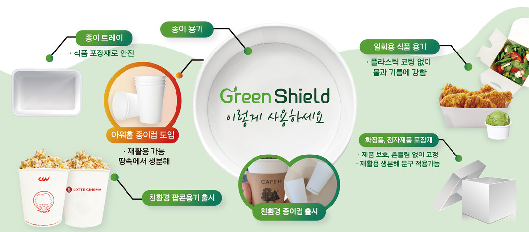 이런 대안으로, 한국제지는 국내 최초 종이에 플라스틱 코팅 대신, 친환경 코팅을 적용한 그린실드를 출시했다.
