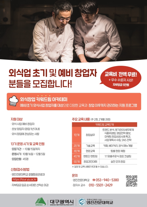 [뉴스스텝] 대구광역시는 외식업 예비창업자와 초기 창업자의 안정적 정착을 지원하기 위해 외식창업 ‘키워드림’ 아카데미 13기 참가자를 10월 15일까지 모집한다.